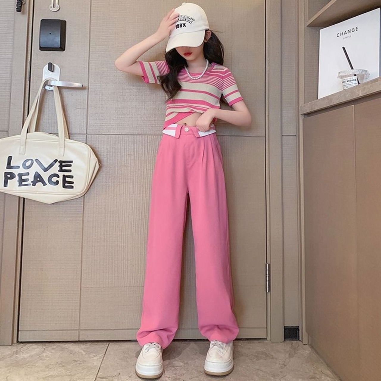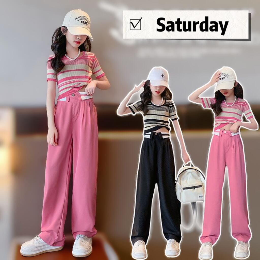 Saturday 120-170cm ボーダーサマーニット半袖トップス+ワイドパンツ セットアップ おしゃれキッズコーデ ガールズ 子供服 ダンス衣装 sk23070103