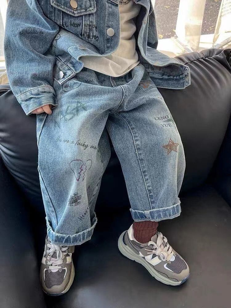 Saturday 100-140cm キッズ 男の子 落書き風デニムセットアップ おしゃれ男の子服 小学生 中学生 ボーイズ子供服 韓国系子供服 sk23110301